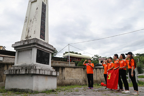 全宝藏同志为保护革命情报与敌人激战后身负重伤,奋力将革命情报藏于商家村灌江鸡婆石下而后壮烈牺牲的事迹,年仅25岁。首先参观了桂北游击队在商家村的战斗地点矗立的雕像,雕像在尚家村口,生动庄严,人物神情坚毅。随后,来到了保存革命情报的鸡婆石,朴实的石头见证了当年腥风血雨的战斗。最后,实践团来到位于商家村顺溪小学旁的全宝藏烈士纪念塔,为表达对全宝藏同志的尊敬和仰慕,实践团全体成员面向烈士塔默哀一分钟,并重温入党誓词,旨在缅怀先烈,牢记入党初心。