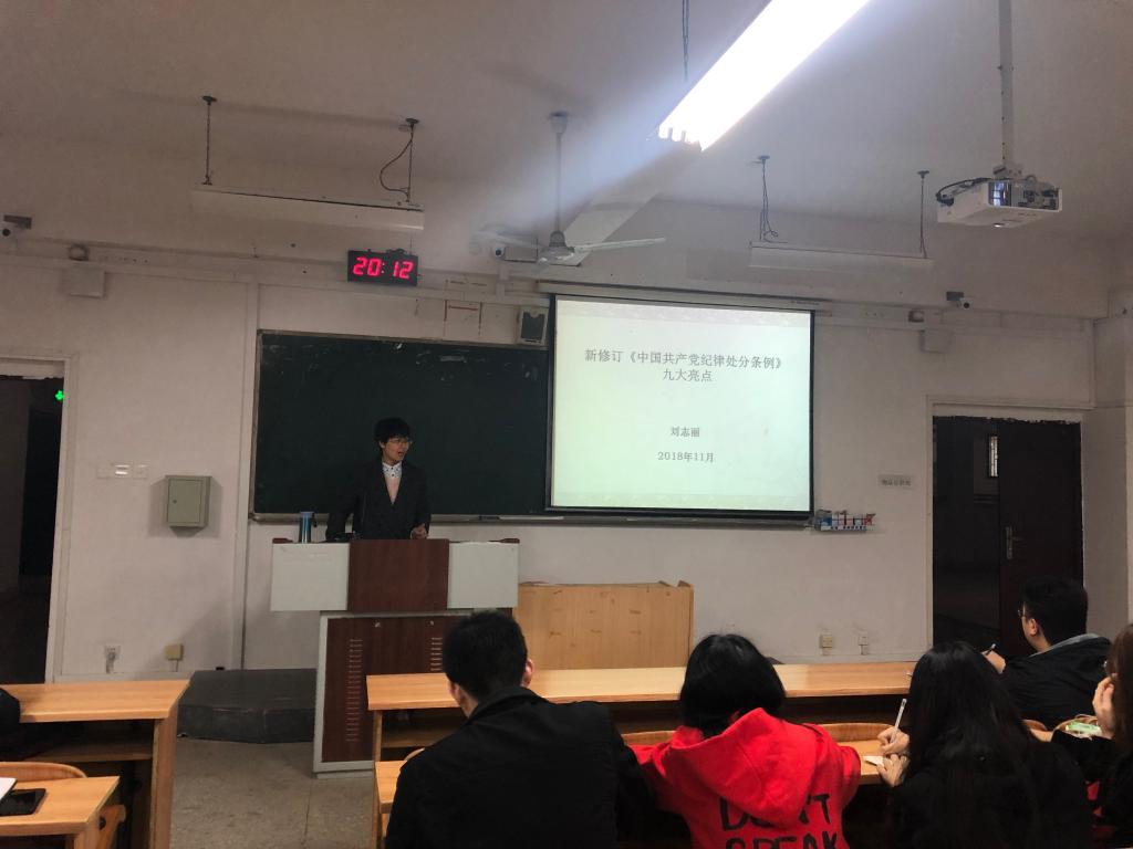 2018年11月14日晚,在雁山校区06301教室,学院党委副书记刘志丽为全体学生党员上党课,学习新修订的《中国共产党纪律处分条例》。 党课现场(一) 党课现场(二)