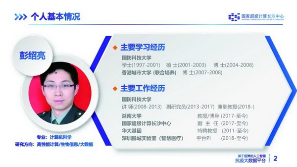 2020年5月12日,我校讲座教授,国家超级计算长沙中心(湖南大学)彭绍亮教授应邀举办一场《基于超算的人工智能抗疫大数据平台》网络学术报告会。报告会由学院董明刚副院长主持,学院研究生及部分教职工共60多人网上参加了报告会。科技助力全面抗疫防疫,可以从防疫控疫、检验检测、药物疫苗发现等多方位着手。彭教授在其报告中介绍了国家超算长沙中心于2020年主持和参与研发的《基于超算的人工智能抗疫大数据平台》,平台主要包含以下几大计算系统: (1)基于超算的人工智能病原检测和抗病毒药物重定位大数据平台;(2)基于临床和社交网络大数据的人工智能可视化主动防疫安全网;(3)大规模人群非接触式高精度体温实时测量和疫情监测系统;(4)抗疫复工复学心理健康呵护公益平台。 系统1提出基于异构生物医药网络的人工智能病原微生物检测和药物设计方法。已助力军事医学科学院毒物药物研究所发现了雷米迪维、氯喹、利托那韦等老药在细胞层面上对新冠病毒有抑制作用,正在进行临床测试。 系统2可进行疫情实时监测和预警、挖掘传染路径、数据可追溯和防篡改等。平台结合了医生、患者和易感人群的临床和社交网络数据,已推出微信公众号和小程序(公众号:普外在线)。 系统3系统基于超算、生物医疗大数据和5G技术等进行大规模人工智能机器学习,依托超算强大的算力,能够自动识别、提取大规模移动目标,5米,0.2秒就可实现测温、校正和报警,精度约0.2度(已获医疗许可证)。可以进行大规模流动人群的额头体表温度的快速检测,可以有效、安全、准确的在流行疾病期间进行疫情防控。可进行大规模人群的体表温度的快速检测,已部署在春晚现场、怀化高铁站、北京协和医院等公共场所。 系统4可以筛查、疏导、帮助疫情和复工复学中出现应激心理反应的人群,还可以分析应激心理人群的类别和地区分布特征,为相关部门提供决策支撑。 报告结合当前实际,对计算机技术助力防疫工作进行了较全面的介绍。会后彭教授就同学感兴趣的一些技术问题进行互动交流,并鼓励大家勇于进行跨学科研究,做出一些项天立地的工作。 图1:系统1 图2:系统2 图3:系统3 图4:系统4 图5:彭绍亮教授简介
