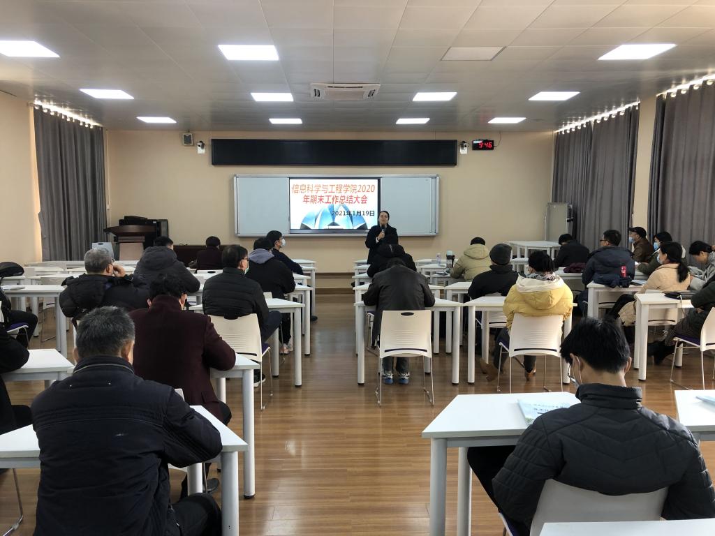 1月19日,我院在屏风校区11202召开2020年度期末工作总结大会。学院全体教职工参加会议。会议由学院党委书记江云清主持。 首先,谢晓兰院长首先就本年度学院绩效分配总体情况作介绍,其中包括了重点业务完成情况、教学工作业绩情况、学科竞赛获奖情况、科研情况、人才引进情况等八个方面。接着,围绕本年度的工作任务完成情况和下学期的目标规划。邓昀副院长针对考研情况、教师培训、教学竞赛、教研教改、校本课程建设、教材建设等方面工作作了总结交流,对二级学院本科教学工作考核指标体系进行了讲解。其他分管领导分别对下学期的工作计划提出了设想。随后,学院党委书记江云清向与大家传达了今年1月4日召开的学校期末中层干部会议上校领导讲话精神。 其次,学院对“2020年度院级考核优秀个人”和“2021年十佳授课教师”进行了表彰,对他们在本年度认真负责的工作态度,卓有成效的工作业绩给予了充分肯定。 最后,江云清书记详细介绍了2020年学院年终绩效工作分配方案,并对2021年工作提出三点希望和要求:一是理念上,加强顶层设计,找准目标,咬定青山不放松,争取下一年绩效考核再创佳绩;二是信心上,鼓足勇气,增强自信,提振精神加油干;三是作风上,爱岗敬业,埋头苦干,扎实工作,上下一心。