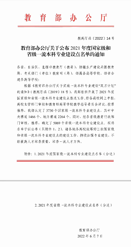 喜讯:我院再添两个国家级一流本科专业建设点