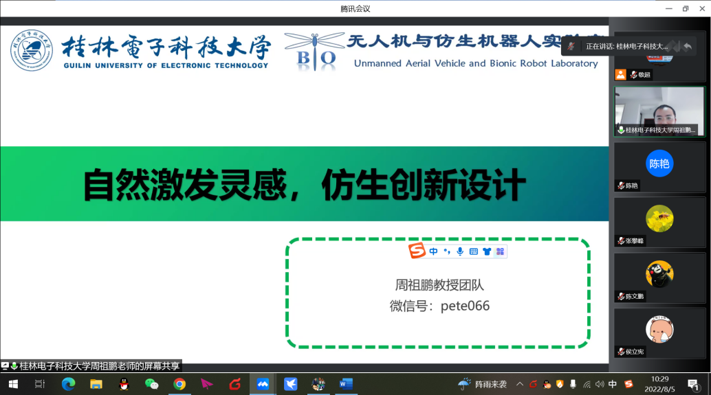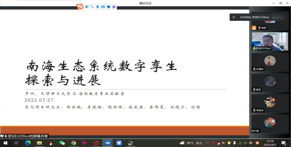 为加强学科建设,2022年8月5日信息学院邀请了温州大学计算机与人工智能学院特聘教授黄辉副院长以专业核心课程群建设与实践——以网络工程专业为例,重点分享了如何面向新工科人才培养需求,遵循学生中心、产出导向、持续改进理念,优化人才培养目标与毕业要求,重构课程体系,实施专业核心课程群的一流建设,促进网络工程新工科深化的路径与方法。 温州大学特聘教授黄辉报告部分截图 接着,桂林电子科技大学教授,博士生导师,桂林电子科技大学特设二档周祖鹏老师的报告主要介绍了团队与国际知名学者合作的主要研究成果,同时,讲座还将介绍团队在仿生机器人领域授权的多项发明专利。最后,讲座将重点介绍目前比较前沿的仿生学研究现状。 桂林电子科技大学周祖鹏教授部分截图 最后,天津理工大学教授,博士生导师,中国计算机学会(CCF)理事、杰出会员、杰出讲者、CCF虚拟现实与可视化专委会主任,智网互联实验室创始人罗训教授以南海生态系统数字孪生探索与进展为题,主要讲述了其科研团队通过与海洋科学团队密切协作,在南海生态系统数字孪生方面取得了一定的进展,并已建立了与加勒比海沿岸国家等科研团队的合作关系,将基于南海的数字孪生成果应用到一带一路生物多样性保护工作中。