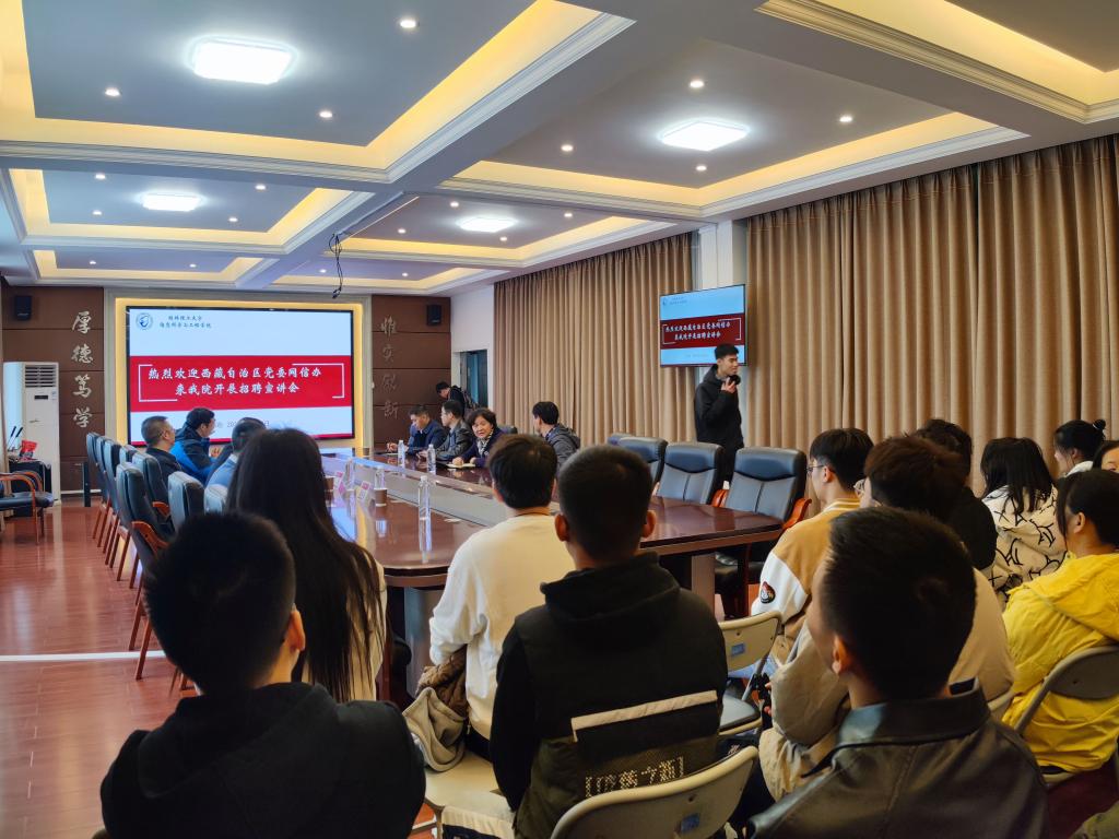 11月14日,西藏自治区党委网信办在雁山校区立信楼02507会议室举行2024年人才引进工作招聘宣讲会。此次来校招聘,由西藏自治区党委网信办副主任汪刘艳带队,桂林市委宣传部二级调研员汤榕陪同,学院高度重视并积极配合做好有关工作。学院党委书记熊英、副书记宋玉辉、副院长董明刚及部分2024届毕业研究生参加了宣讲会。 会上,熊英书记代表学院对汪刘艳副主任一行的到来表示热烈欢迎,并衷心感谢西藏自治区党委网信办对学校的认可和肯定。之后,西藏自治区党委网信办信息化发展处副处长刘书炘就此次拟招聘的岗位需求、政策支持、工作待遇和职业发展等问题作了详细说明。干部处管培霞老师为同学们播放了宣传片并介绍了招聘岗位相关情况,让同学们了解到西藏不仅是神秘而美丽的地方,更是当代青年投身社会服务、实现自我价值的舞台。之后,汪刘艳副主任与同学们亲切交谈,表达了欢迎同学们赴藏工作,为国家建设发展贡献青春力量的期望。 下一步,学院将继续加大毕业生就业指导和服务,积极宣传国家政策,引导学生到党和国家各项事业最需要的地方就业,在基层服务中建功立业,为民族复兴、强国建设提供源源不断的人才生力军。 会议现场