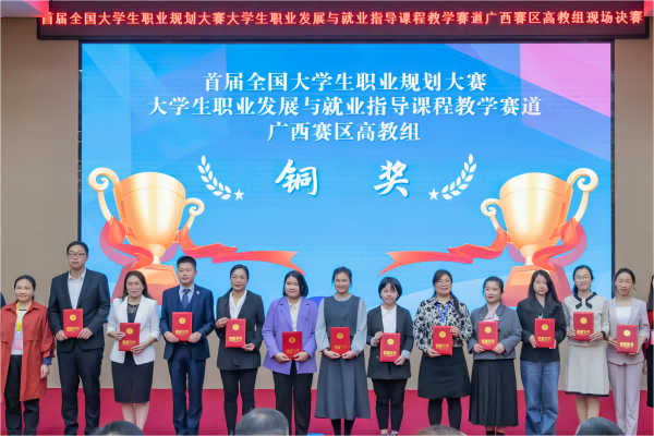 3月16日,首届全国大学生职业规划大赛(课程教学赛道)广西赛区高教组现场总决赛在南宁师范大学举行。学院蒙玲娟老师在大赛中表现出色,荣获广西赛区高教组铜奖。 据悉,本次大赛由自治区教育厅主办,广西高等学校毕业生就业创业指导中心协办。大赛按照高等教育类型分为高教组和职教组,包括初赛网络评审(占总成绩的60%)和现场总决赛(占总成绩的40%)两个环节。现场总决赛分为课程建设情况汇报、互动答辩、教学或指导情景模拟三个环节。 决赛现场,蒙玲娟老师结合学校和专业特色,以及学校人才培养总目标,从课程的基本信息、课程建设、教学团队与教学研究、教学改革与创新、课程资源和实施效果等六个方面对《大学生职业规划与就业指导》课程建设情况进行了8分钟的系统汇报。同时,蒙玲娟老师在现场答辩和情景模拟考核环节,展示了其扎实的课程教学功底、深厚的生涯理论基础以及较强的咨询实践能力。 捷报传来,蒙玲娟老师用实力展现了桂工青年教师的风采,展现出了扎实的教学功底和指导能力。下一阶段,学院将以此次大赛为契机,充分发挥“以赛促改、以赛促教、以赛促就”的作用,持续推进大学生生涯发展教育,提高大学生生涯教育水平和育人实效,实现高质量充分就业。 蒙玲娟老师参加比赛现场图 颁奖仪式现场(左四为蒙玲娟老师) (一审:蒙玲娟;二审:孟德;三审:黎超业)