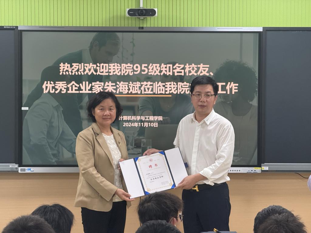 朱海斌报告会现场 院长谢晓兰代表学院对朱海斌校友的到来表示热烈欢迎和衷心感谢 党委书记熊英代表学院为朱海斌校友颁发聘书 (一审:孟德;二审:谢晓兰;三审:熊英)