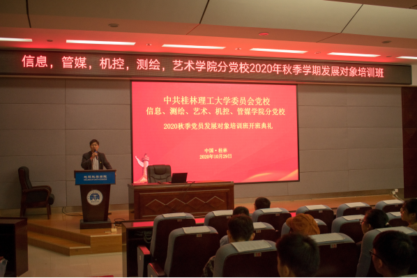2020年11月29日晚上7:00,由我院分党校主要负责,管媒学院、机控学院、测绘学院和艺术学院分党校联合开办的2020年秋季学期发展对象培训班开班典礼在01501教室顺利举行,来自全校五个学院的165名发展对象参加了开班典礼,信息学院党委书记江云清做了开班动员。 江云清书记对全体参训学员表示热烈欢迎并作动员讲话,提出了殷切希望有要求。他指出,端正入党动机是争取入党的首要问题。入党动机是一个人要求入党的内在原因和真实目的。发展对象要高度重视学习培训活 ,珍惜机会,在学习中丰富党的理论知识,提升政治素养,不断完善自身政治理论水平,自觉从思想上、行动上先入党,并以实际行动争取早日加强入党组织。