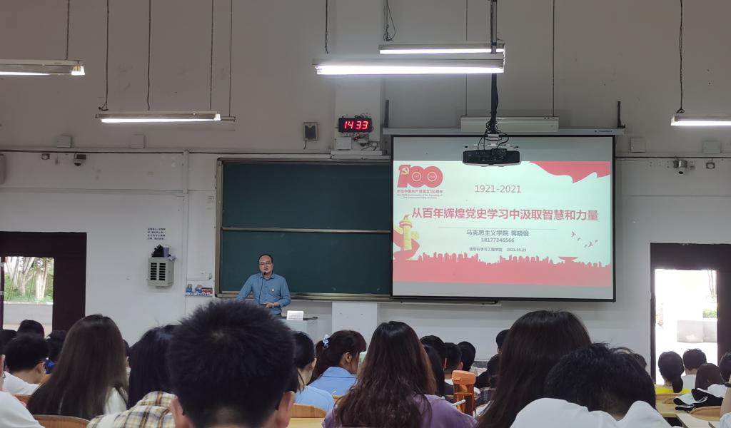 5月25日,学校党史学习教育宣讲团成员、马克思主义学院副院长蒋晓俊老师应邀来我院作主题宣讲。学院师生党员120多人参加宣讲会。 讲座现场 蒋晓俊老师以《从百年辉煌党史学习教育中汲取智慧和力量》为主题,以应知应会党史知识测试为切入点,从党史学习教育的重要意义、中共百年奋斗的光辉历程、党史学习教育的重点内容、百年党史对我们的深刻启示等四个方面介绍了100年来中国共产党的光辉历程和百折不挠的奋斗历史,让党员们深刻领会到在全党开展党史学习教育,是以习近平同志为核心的党中央作出的一项重大决策,是党的政治生活中的一件大事。蒋晓俊老师希望大家从百年党史中感悟思想伟力,从百年奋斗中汲取前进力量,坚定理想信念、传承红色基因,树立远大理想、担当时代责任,不断地提高政治判断力、政治领悟力、政治执行力,为实现中华民族伟大复兴的中国梦贡献力量。 此次活动是学院党史学习教育的再动员,是坚定“四个自信”、做到“两个维护”的再教育。蒋晓俊老师的宣讲,帮助学院师生党员从党史学习教育中不断汲取营养,不忘初心,牢记使命,以更加饱满的热情投身到教书育人和学习生活中去,自觉为学院事业发展和教育教学改革作出新的更大的贡献。