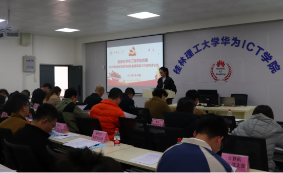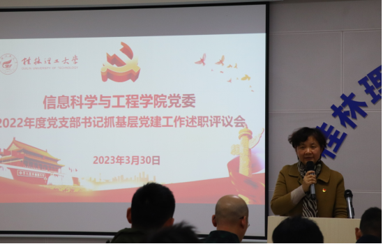 为进一步加强基层党组织建设,促进党支部书记聚焦基层党建履职,2023年3月30日下午,学院在雁山校区立信楼02525召开2022年度党支部书记抓基层党建述职评议大会。会议由组织员阎安明同志主持,学院党委委员、各党支部书记、党员代表、群众代表60余人参加会议,此次述职采取“一述一评一测”的方式进行。 会议伊始,阎安明同志介绍了会议的流程及述职测评办法,蒙玲娟老师向大会通报了2022年度各党支部活动宣传稿件、学习强国积分等情况。会上,15位党支部书记围绕2022年抓党建工作情况依次展开履职汇报,汇报学习贯彻党的二十大精神、抓党建工作、问题整改及下一步工作思路等工作;学院党委书记熊英对各党支部述职情况进行逐一点评。述职结束后,30余名测评人员填写《信息科学与工程学院2022年度党支部书记抓基层党建工作民主评议表》,对党支部书记述职情况进行考核测评。经过述职评议及结合日常工作情况,并经学院考核领导小组讨论,阎安明、董明刚、李雪三位党支部书记被评为“好”等次,其他12名党支部书记被“较好”等次。 学院党委书记熊英最后作总结讲话,她充分肯定了学院基层党支部书记抓党建工作取得的成效,指出了存在的问题与不足,并就进一步做好2023年支部党建工作提出了三点要求:一是要深入学习贯彻习近平新时代中国特色社会主义思想和党的二十大精神,不断强化党支部的政治建设;二是要持续创新工作思路,提升党建与业务工作融合,切实推动党建工作提质增效;三是要凝练工作特色、打造党建品牌,进一步提升党建工作水平。