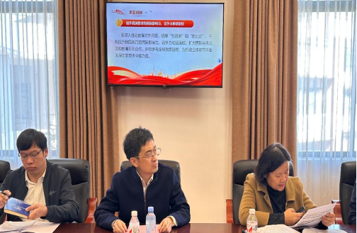 11月29日,学院在02507会议室组织召开党委理论学习中心组第七次集中学习会,学校党委常委、副校长王磊应邀到会旁听学习过程并作现场指导。学习会由学院党委书记熊英主持,学院党委委员、纪委委员、工会委员及各科室负责人参加了会议。 会上,在各位中心组成员领学下,与会人员集中学习了习近平总书记系列重要讲话和重要文章精神,包括在全国教育大会上的重要讲话《紧紧围绕立德树人根本任务,朝着建成教育强国战略目标扎实迈进》,在全国民族团结进步表彰大会上的重要讲话《推进中华民族共同建设 巩固发展中华民族大团结》,在中共中央政治局第十五次集体学习时的重要讲话《贯彻落实新时代党的建设总要求 进一步健全全面从严治党体系》,以及今年第17期《求是》杂志发表的重要文章《培养德智体美劳全面发展的社会主义建设者和接班人》。领学结束后,与会人员聚焦学习内容,结合自身工作实际进行了研讨发言。 王磊认真聆听了大家的发言,并作了讲话。他充分肯定了此次理论学习中心组的学习成效,指出此次学习领导重视、准备充分、主题鲜明、形式规范。同时,对进一步规范和提升中心组集中学习成效提出指导性意见:一是要持续深化理论学习,全面理解和准确把握习近平总书记重要讲话重要指示精神的丰富内涵和精神实质,做到学深悟透、学懂弄通。二是要坚持为党育人为国育才,切实将立德树人根本任务贯穿于教育教学全过程,确保教育的正确政治方向和价值导向。三是要加强学习成果运用,将学习成果转化为推动工作的强大动力和实际成效,确保各项要求落地生根,为学院的改革发展提供坚实的思想保障和组织保障。 会上,还安排学习了《中华人民共和国保守国家秘密法》和《中华人民共和国保守国家秘密法实施条例》等内容。 学校党委常委、副校长王磊参加会议并讲话 活动现场 (一审:孟 媛;二审:阎安明;三审:熊 英)