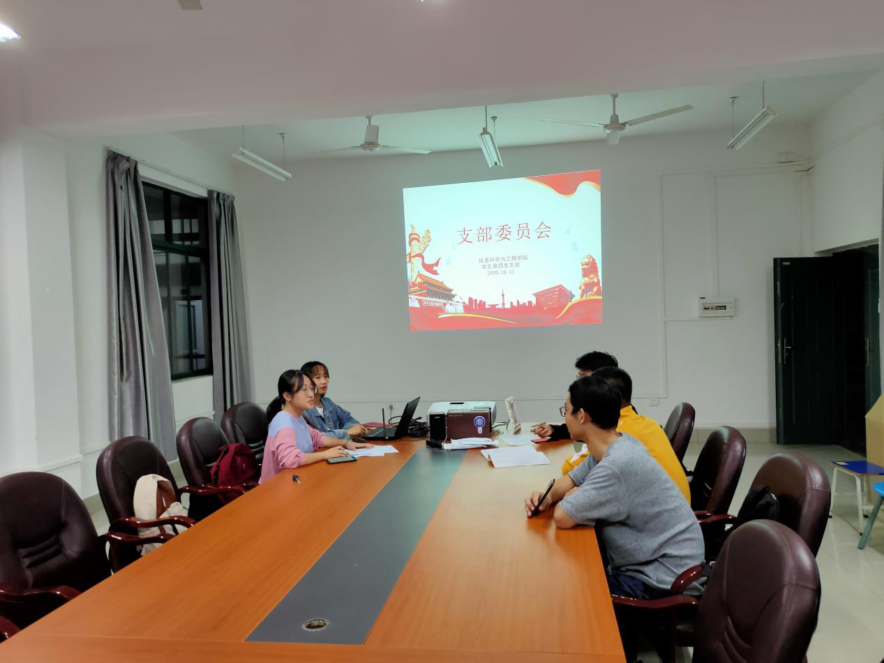 10月14日,信息学院学生第四党支部在立信楼02501会议室召开了党支部委员会。支部委员均参加此次会议,会议由卢瑞明同志主持。 会上,卢瑞明同志首先对近期的工作情况进行总结,并提出相关问题,建议委员们今后在开展工作前应事先做好策划,同时确保与会人员的参会达率和提高活动的实效性。随后,支委们就近期将开展的工作进行讨论。 通过此次支委会,支委们明确近期工作任务,并表示将始终坚定立场,不忘初心,勤勉工作,认真钻研,主动学习党的先进知识,提高自身的党性修养,真正做到带头模范作用,为党支部的建设积极贡献力量。 学生第四党支部委员会