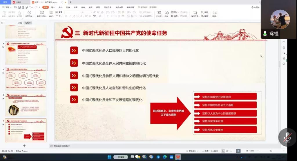 为深入学习贯彻党的二十大精神和习近平总书记系列重要讲话精神,2022年11月22日,计算机第一学生党支部开展“深入学习贯彻党的二十大精神”主题党日活动。受疫情影响,本次活动转为线上,支部全体党员参加,支部副书记钟美薇主持。 钟美薇同志领学了党的二十大报告原文,全面回顾党和国家自党的十九大以来取得的伟大历史成就和新时代十年的伟大变革,科学擘画了未来中国的发展蓝图。着重学习了关于“实施科教兴国战略,强化现代会建设人才支撑”篇目。钟美薇强调,科技是第一生产力,人才是第一资源、创新是第一动力,党对青年寄予厚望,同志们要认真领会领悟党的二十大精神实质,不断从中国共产党的发展历程中汲取经验,把理论学习与自己的学习生活相结合,在感悟中学、在实践中学,坚持自主创新,争做担当民族复兴大任的信息化时代新人。 此次主题党日活动的开展,同志们更加深刻地认识到作为新时代的新青年,要坚定不移听党话、跟党走,怀抱梦想又脚踏实地,敢想敢为又善作善成,立志做有理想、敢担当、能吃苦、肯奋斗的新时代好青年,让青春在全面建设社会主义现代化国家的火热实践中绽放绚丽之花。 线上主题党日活动现场