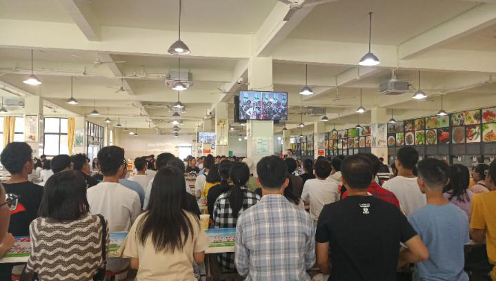 2019年10月1日上午,庆祝中华人民共和国成立70周年大会在北京天安门广场隆重举行,中共中央总书记、国家主席、中央军委主席习近平出席大会并发表重要讲话。我院组织师生通过多种形式收听收看庆祝大会盛况,认真学习聆听习近平总书记的重要讲话,观看盛大的阅兵式和群众游行,热烈庆祝中华人民共和国成立70周年! 我院师生党员在立信楼02501会议室集中收看了庆祝大会盛况。师生们跟随现场演奏热情高歌《我和我的祖国》等歌曲,向伟大祖国70华诞送上由衷祝福。此外,老师们、同学们还自发通过电视、网络、广播等不同媒介收听收看了大会盛况,通过QQ、微信互动表达了对祖国母亲的真挚热爱,表示将认真学习领会习近平总书记重要讲话精神,刻苦学习,积极工作,为实现中华民族伟大复兴的中国梦作出自己的贡献! 我院师生在02501会议室集中收看庆祝大会 我院师生集中收看庆祝大会 同学们在食堂集中收看庆祝大会 图文来源:马得华
