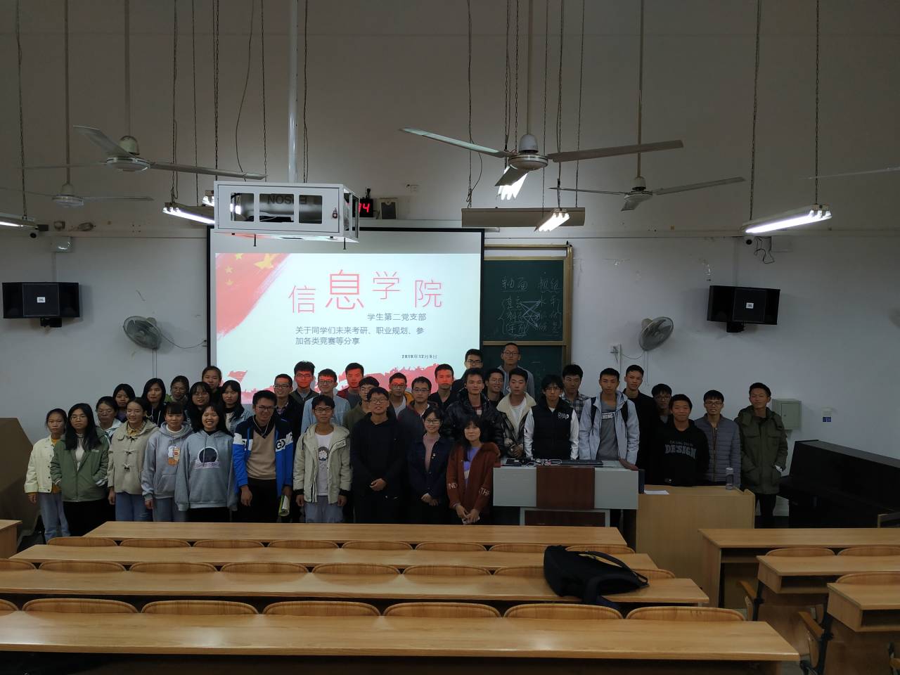 12月5日下午,在学院党委的组织以及党支部同志们精心准备下,学院本科生第二党支部在07518教师成功举办了经验分享交流会。 本次经验交流分享会面向电信19级1、2、3班的同学,沈林玉、王晶莹、曾会如三位同志分别从就业经验、考研注意事项及各类科技竞赛的普及三方面进行分享。三位同志通过分享自己从新生的角色转变、在大学学习生活期间的经验所得、参加各类科技与知识竞赛的心路历程和自己在考研路上的心态转变。通过三位同志的经验分享以及共同探讨同学们的提出的相关问题,使19级的同学们明白了把握现在、规划人生的重要性,更加明确了今后学习的目标与未来努力的方向。 此次经验分享交流会充分发挥了党员同志们的模范带头作用,通过分享与交流的方式让19级的同学们阔视野,宽思维,同时让同志们与群众进一步的进行沟通交流。希望今后在学院党支部的带领下各位同志继续努力,以更好的方式来服务同学。