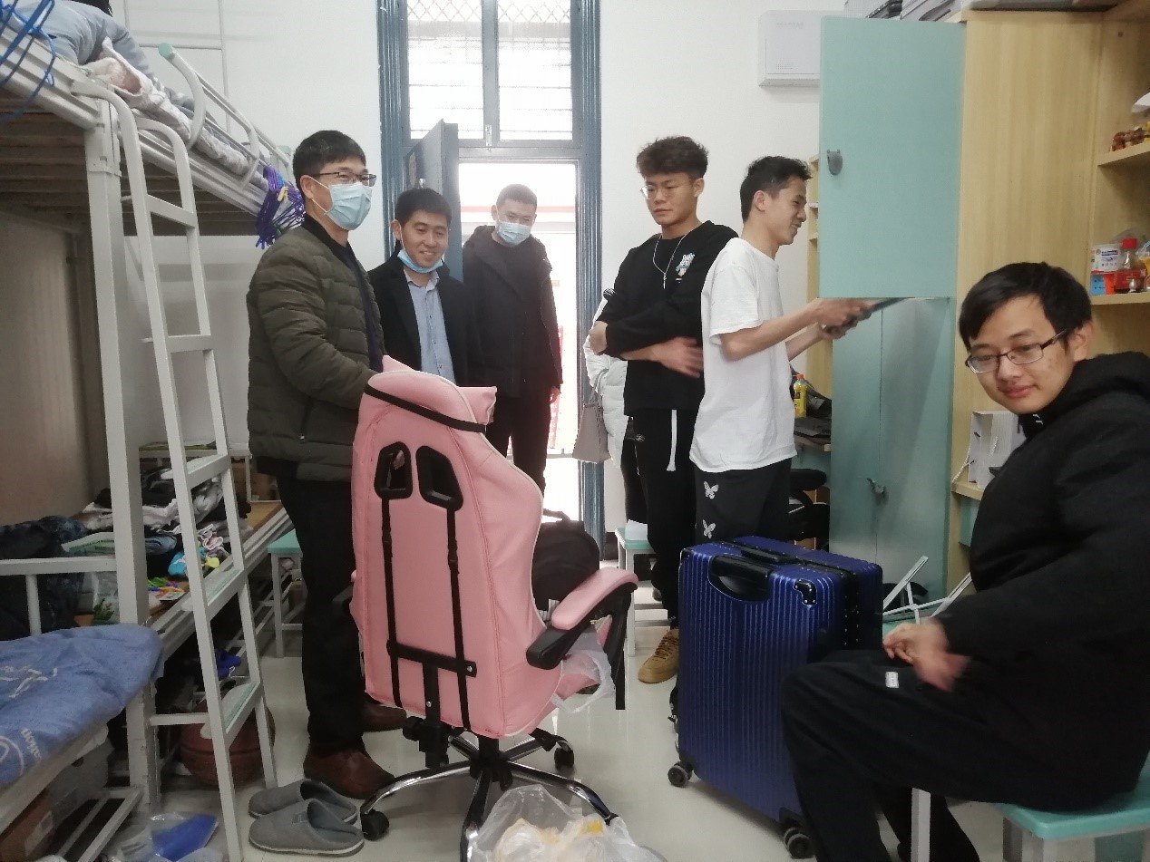 为深入了解学生返校情况以及调整状态,3月2日下午,信息科学与工程学院党委书记江云清、党委副书记宋玉辉带领学院11名辅导员深入走访学院学生宿舍。 走访过程中,学院领导与宿舍的同学们进行深入交谈,并询问学生学习情况、宿舍供水设备是否损坏以及了解大家寒假生活的情况和返校途中的点点滴滴。江云清书记嘱咐同学们配合学校做好疫情防控工作,减少聚集流动,坚持做好返校后14天健康观测,并强调舍友之间要相互关心、相互帮助,积极发挥团队协作精神,共同营造良好的学习、生活环境,以崭新的精神面貌投入到新学期。 此次学生宿舍走访,充分体现出了学院领导在疫情防控背景下对学生学习生活的关怀,在了解学生宿舍情况的同时,也进一步增进了师生情谊,对督促同学们养成良好生活习惯、焕发精神活力注入了新能量。 学院领导与学生交流现场(一) 学院领导与学生交流现场(二) 学院领导检查宿舍设备情况