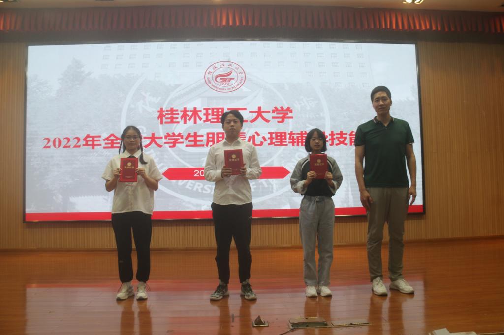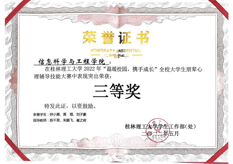 5月6日晚,由桂林理工大学心理健康教育与咨询中心主办,环境科学与工程学院承办的2022年“温暖校园,携手成长”全校大学生朋辈心理辅导技能大赛决赛在雁山校区图书馆报告厅举行。经过主题班会视频展示、心理健康知识测试两个环节,最终各学院共11个队伍晋级现场决赛。学院由钟小惠、黄琨、刘子豪三名同学组成的代表队以突出的表现荣获此次大赛三等奖。 主题班会视频展示中,学院代表队组织电子信息类2021-6班同学开展了以“走进心理咨询室”为主题的班会拍摄。该主题班会的设计旨在带领同学们了解心理咨询,破除同学们对心理咨询的偏见,增加同学们的积极求助意识,提升同学们的心理健康素质。现场决赛环节为朋辈心理辅导展示,学院参赛选手用自己的耐心、爱心与专业知识向现场评委与观众展现了一名心理委员应具备的素质与能力,最终打动了案例扮演者,受到了评委老师好评并获得较好成绩。 本次获奖既是对我院朋辈组织以及心理委员专业素养的充分肯定,也是对我院心理健康教育工作成效的认可。本次比赛提升了学院朋辈组织及心理委员的专业能力,增加了学院学子的心理健康知识素养,强化了学院学子的心理健康互助意识,为学院心理健康教育奠定了良好基础。