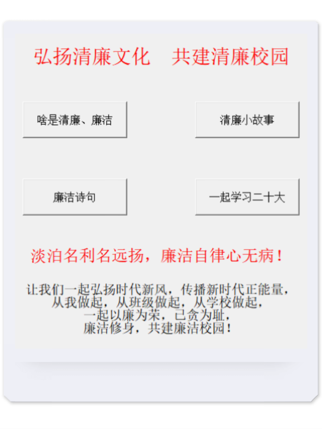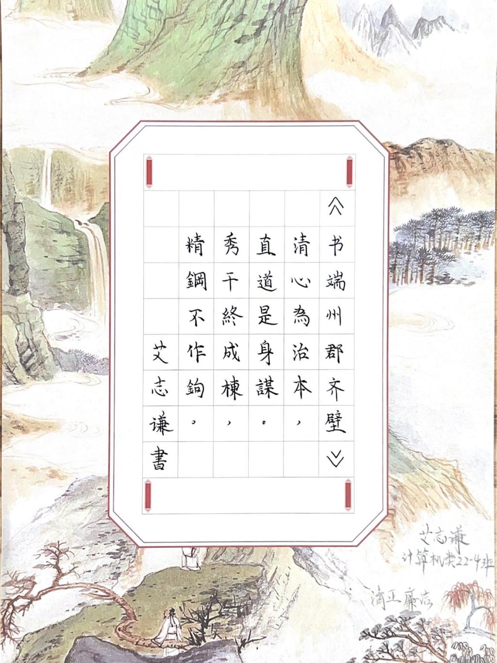 为大力弘扬清廉文化,建设“清廉学院”和“清廉班级”,营造崇尚廉洁的文化氛围,学院于11月份开展了“百花齐放颂清廉”系列清廉教育活动。活动涉及书法、绘画、摄影、剪纸等作品征集评选,开创性地将清廉教育与学科专业相结合,开展清廉主题编程设计比赛。 清廉作品以思廉、促廉、颂廉、扬廉为出发点和落脚点,通过清廉作品创作、评比,教育引导学生学廉、思廉,爱廉、守廉,积极营造学院“以文化人”、“以文润德”、“以文养廉”的浓厚氛围。此次征集活动提前谋划部署,广泛宣传动员,得到了学生的积极参与,进入评比的22件作品中,既有对博大精深传统文化的颂扬,也有对出淤泥而不染的莲花的称赞;作品或抒怀言志,或警示告诫。作品展示的是艺术境界,传递的是廉洁清风,宣扬的是对高尚精神风貌的追求。 此次清廉文化作品征集评选活动的开展,是积极推动清廉文化进校园,促进广大师生树立勤俭廉洁意识,引领廉荣贪耻的社会风尚的重要举措。学院将以此为抓手,紧紧围绕立德树人根本任务,将清廉文化贯穿于育人工作全过程,不断创新学院清廉文化建设的方式途径,进一步将清廉文化内化于心、外化于行,明大德、守公德、严私德,以坚实的担当和有效的行动助力建设“清廉桂工”。 进入评选的作品 书法类一等奖作品 绘画类一等奖作品 摄影类一等奖作品 剪纸类一等奖作品 编程设计类一等奖作品