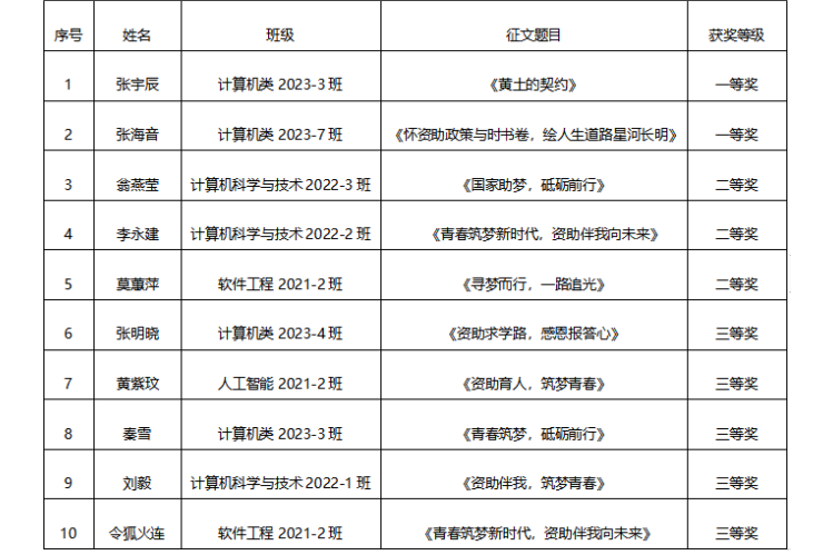 为全面宣传国家资助政策及其实施成效,激励受助学生奋发图强、成长成才,近日,学院积极响应学校“资助育人文化节”工作要求,精心策划并认真组织开展了2024年“青春筑梦新时代,资助伴我向未来”资助主题征文比赛。 自比赛启动以来,收到了来自学院各年级学生的踊跃投稿,同学们的参与热情高涨,每一篇作品都蕴含了同学们的真挚情感和深刻思考,从中我们能感受到学生对国家资助政策的深切体会与由衷感激。经过学院评委老师的细致评审,最终评选出了一批优秀的作品。其中一等奖2名,二等奖3名,三等奖5名。 此次比赛不仅为学生提供了一个展现才华的舞台,更激发了学生对资助政策的深入关注和深刻思考。我们相信,这些优秀的作品将在未来的日子里,成为激励更多学生珍惜机会、发奋学习、感恩回馈社会的强大精神动力。 获奖名单 (一审:崔之府;二审:孟德;三审:黎超业)