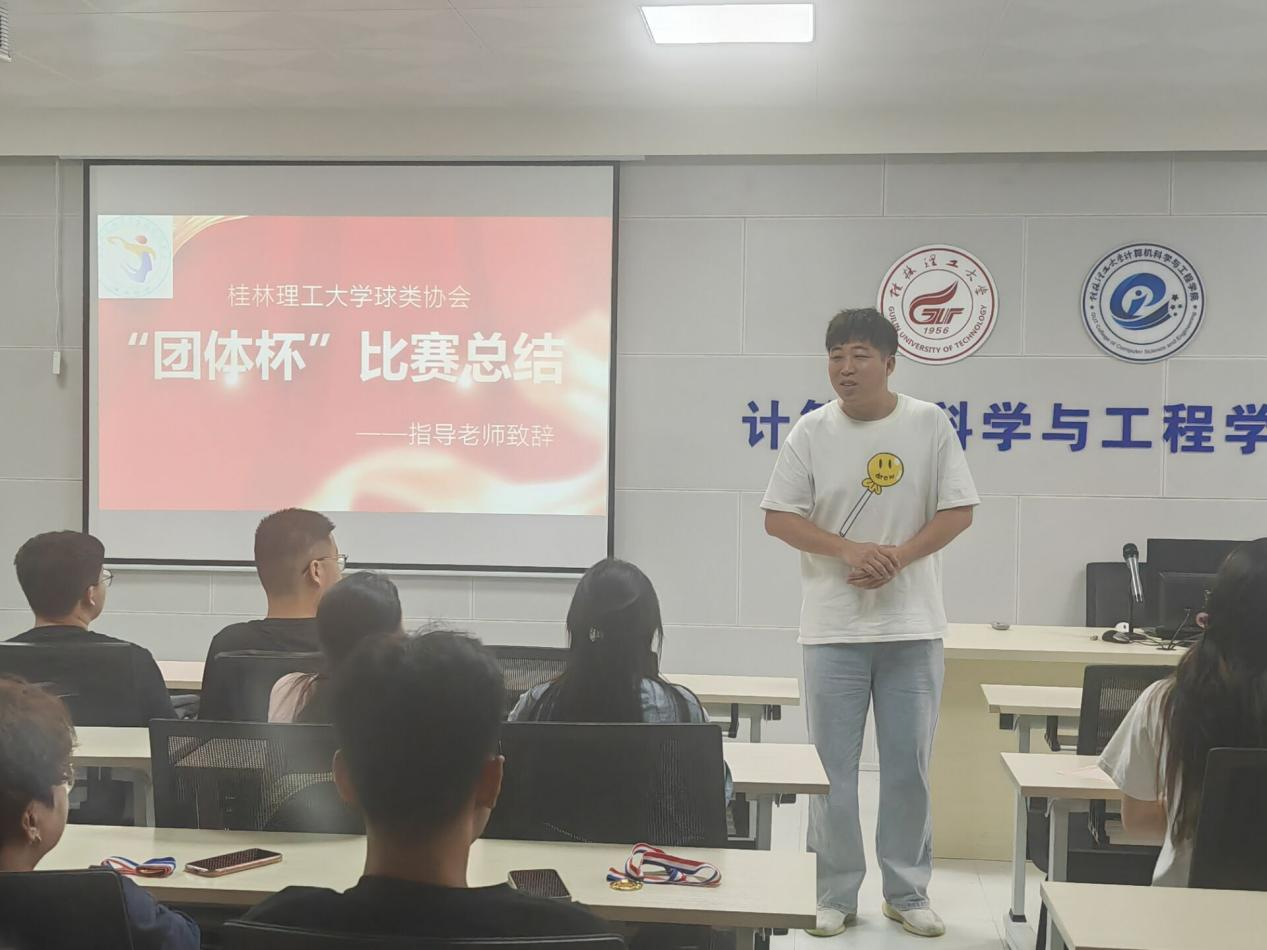 5月30日,桂林理工大学第四届学生团体杯球类大赛颁奖仪式在雁山校区02525室召开。颁奖仪式由球类协会副会长苏芷瑜主持,球类协会指导老师孟德出席仪式。 副会长苏芷瑜宣读羽毛球,乒乓球,排球,桌球获奖者名单,并与孟德老师、会长唐佳骏一起为各名获奖同学颁发证书。 最后,孟德老师对学生团体杯比赛作了总结,并提出未来发展愿景,希望桂林理工大学球类协会在未来能够带领学生走出本校,走向更加宽广的舞台,带动桂林理工大学体育赛事的发展。同时,在此祝贺各个获奖的学院,希望获奖的学院再接再厉,再创佳绩;另外希望未获奖的学院不要气馁,争取在下一次的比赛中勇夺桂冠。最后,感谢同学们的热情参与,希望同学们能保持对体育的热爱,期待大家下一次的精彩比赛!