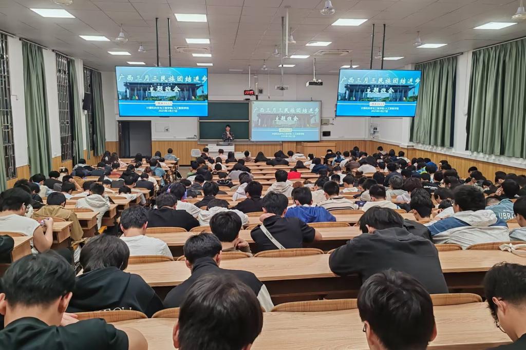 为深入学习贯彻习近平总书记关于加强和改进民族工作的重要思想,不断促进各族师生交往交流交融,让中华民族共同体意识根植各族师生心灵深处,推动铸牢中华民族共同体意识,提升大学生的法治素养,我院于3月28日在雁山校区06509教室组织开展“中华民族共同体意识”主题班会,学院1900余名本科生及学生工作办公室全体老师参加此次主题班会。 班会上,各年级辅导员紧紧围绕习近平总书记关于民族团结进步的重要论述、我国的民族政策以及如何维护民族团结三个方面,讲述了“休戚与共、荣辱与共、生死与共、命运与共”的共同体理念。图文并茂的PPT向学生全方位展示了“广西三月三”这一传统节日的独特魅力,从壮族悠扬婉转的山歌对唱,到瑶族热情奔放的盘王舞;从侗族气势恢宏的大歌合唱,到苗族绚丽多彩的服饰展示,每一个画面都深深吸引着同学们的目光,让他们仿佛置身于热闹非凡的民族盛会之中。最后,在民族团结教育的基础上,各年级辅导员们结合实际案例,为全体学生上了一堂生动的法治课。从校园贷陷阱到网络诈骗手段,从校园欺凌的危害到知识产权的保护,每一个案例都像一面镜子,让同学们深刻认识到法律就在我们身边,以实际行动保护好自身合法权益。 此次“中华民族共同体意识”主题班会,使全体学生在感受民族文化魅力的同时,增强了民族团结意识和法治素养,进一步引导全院学生以更加饱满的热情和更加坚定的信念,传承和弘扬民族文化,维护民族团结,遵守法律法规,为实现中华民族伟大复兴的中国梦贡献自己的青春力量。