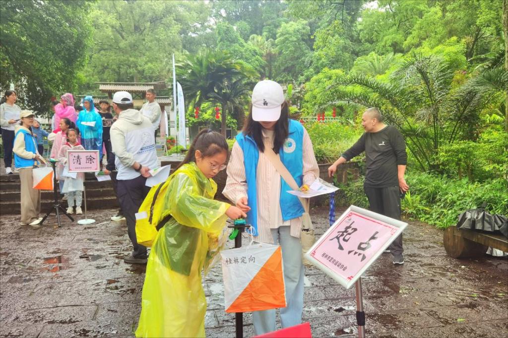 活动当天,学院奋斗社的志愿者们与桂林市定向运动协会的志愿者们带领孩子们一起走进桂林植物园,为孩子们带去了一次生动有趣的探索、发现、体验之旅。在志愿者的带领和保护下,孩子们兴奋地穿梭在植物园中,观察着各种植物的形态和颜色,不时与志愿者交流着自己的发现。在定向活动中,选手们在没有手机定位导航,没有向导的情况下,手持一张地图、一个指北针,按照图纸指示,穿梭在植物园中,在有限的时间里,按顺序到访地图上所标示的22个打卡点进行打卡,在绿意与阳光中感悟“五四青年”的精神内涵。